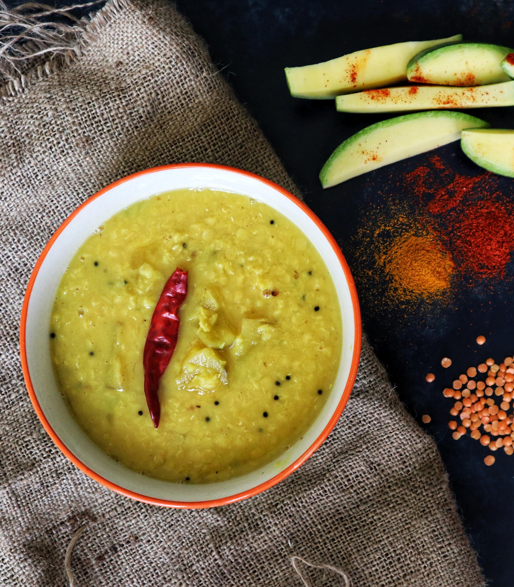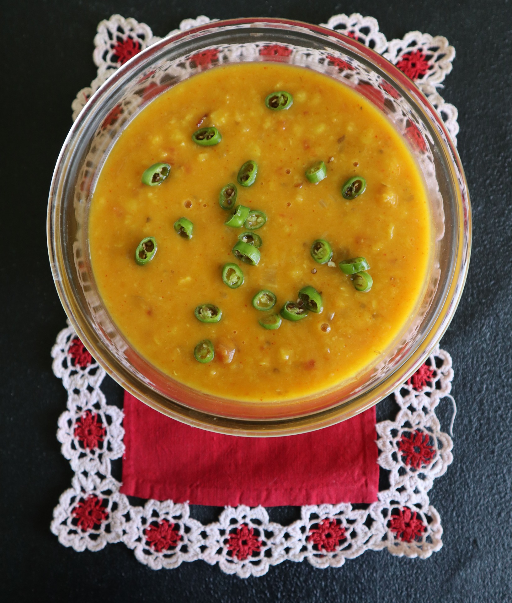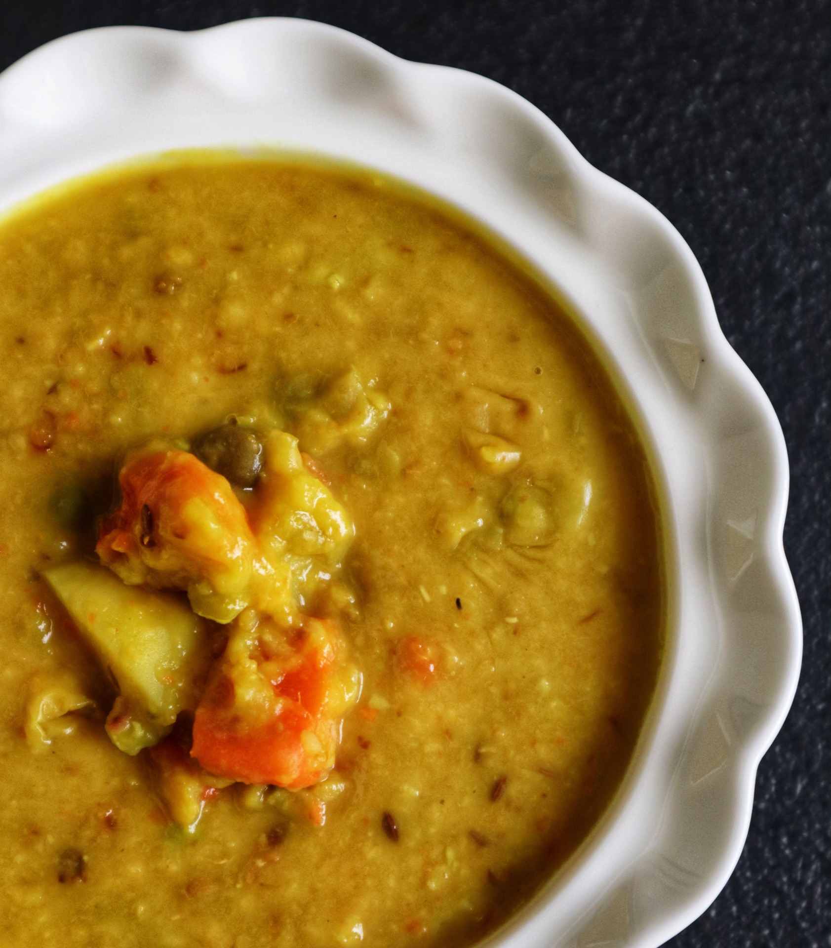 Golden, sweet yellow moong dal is roasted, tempered in whole spices and cooked with a handful of vegetables for a